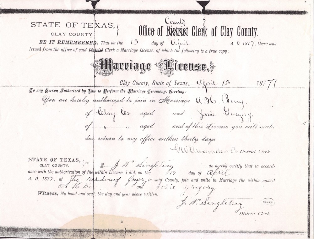 On April 17th 1877 Alexander married Josephine Priscilla Gregory in Henrietta, Clay County Texas.