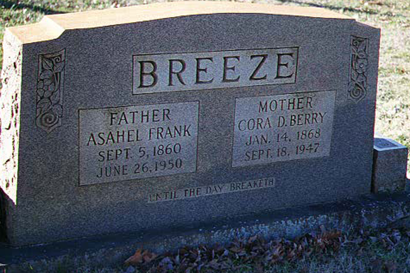 Asahel Frank Breeze and Cora D. Berry are buried at Berrys Grove Baptist Church Cemetery in, Orange County, North Carolina. Cora' Berry's Father and Mother donated the land for the church. Frank Breeze was born on September 5th 1860 and he died on June 26th 1950. Cora Berry Breeze was born on January 14th 1868 and she died on September 18th, 1947.