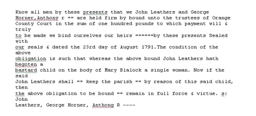 David J. Berry was born about 1774 in Orange County, North Carolina. On February 21st 1797 he married Mary Blalock. Mary already had a little girl when they were married. There was a bastardy bond issued against John Leathers in Orange County, North Carolina, on the 23rd of August 1791. (Transcript of bond). David and Mary Blalock Berry raised Elizabeth Leathers Berry as their own child. David and Mary’s first child must have been Sarah “Sally” Berry because she married William A. Cates in Orange County on February 26th 1817. Sally was probably born April 4th 1796. Winifred Berry also married Joshua Norman on September 19 1820 in North Carolina. The rest of his children married in Georgia.