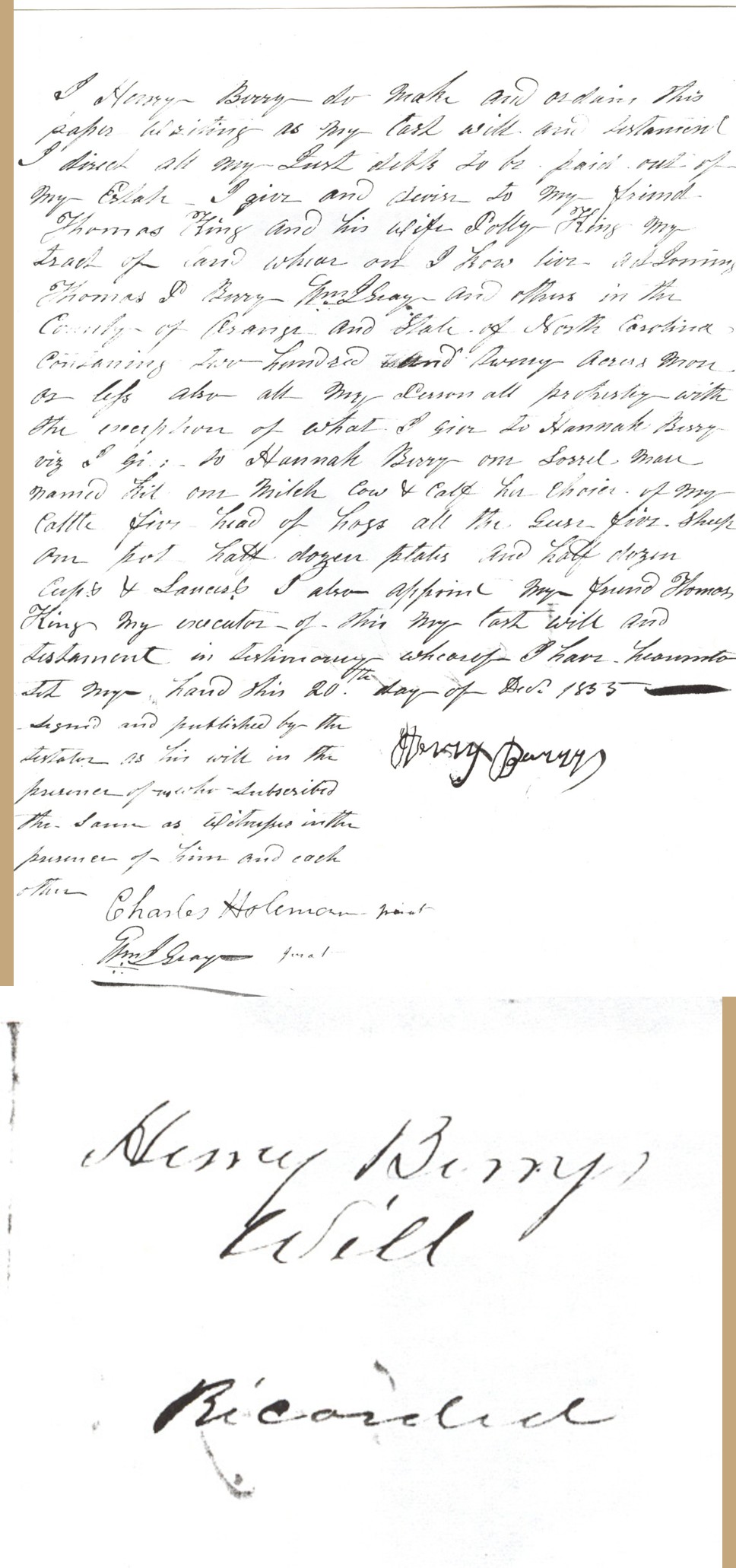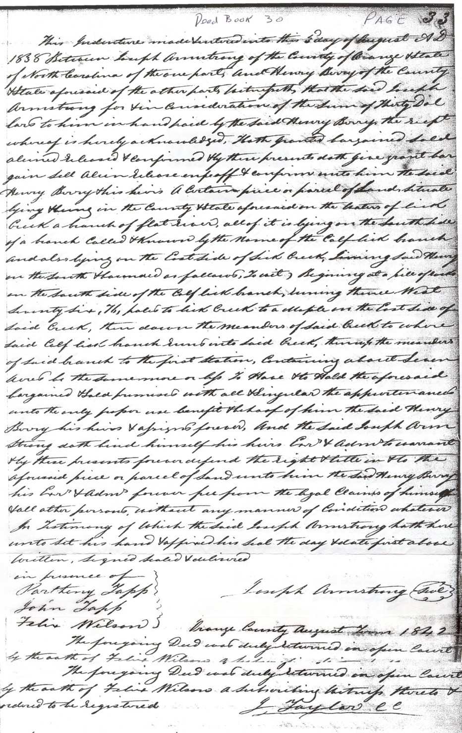Deed Book 30 Page 33Deed Book 30 Page 33 . Henry Purchased land from Joseph Armstrong on the 5th of August 1838. This Land may have been paid for with money Henry Berry was holding for his mentally handicapped brother, Isaac Berry. Isaac Berry died between 1830 and 1840. Henry Berry and Hannah Berry were living together in the 1850 census. Hannah was William Berry's wife but I do not think Henry and Hannah ever married. If you check his will on this page you will see that he leaves some property to Hannah but does not mention her as his wife.