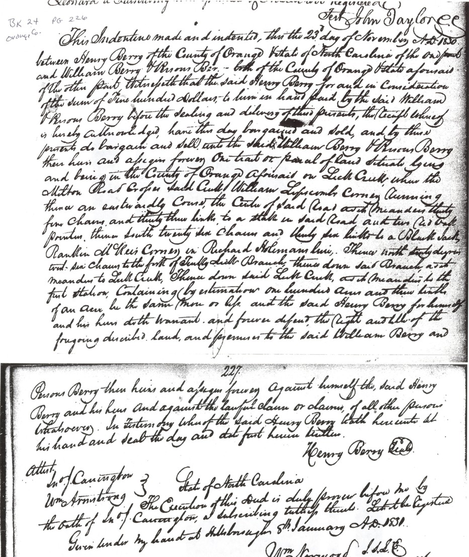 Deed Book 226 Page 24Deed Book 226 Page 24 Henry Berry Sold this land to his two nephews,William Clarence Berry, and his youngest brother Thomas Person Berry. The two brothers were apparently planning to remain in Orange County, North Carolina. All their plans changed in 1833 when William Clarence Berry's wife, Sally Bowles Berry. died giving birth to Rose Ann Frances Berry in 1833.William Clarence Berry and Thomas Person Berry sold the land they had purchased from Uncle Henry Berry Henry and their other brother Robert C.. Berry was a witness to the Sale in 1833. William Clarence Berry and Robert C. Berry left North Carolina and homesteaded in Fayette County, Alabama where their Uncle Robert Berry Jr. was granted land in 1824.