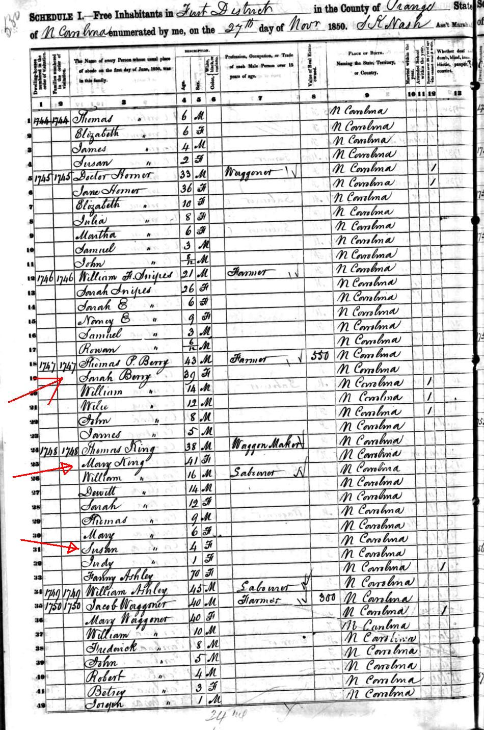 Mary King HeadstoneSusan Crabtree is buried in the Fiddleton Cemetery. Susan is the daughter of Thomas and Mary King who inherited the home place when Henry died in 1855. Henry's Will. In Henry Berry'as will he stated " I give and devise to my friend Thomas King and his wife Polly King the tract of land on which I now live." Polly is a nickname for Mary which explains why Henry Berry left the home-place to Thomas King. There was always a question in my mind why the Fiddleton Plantation Home was left to a friend and not a relative. There was also a question why Mary King was buried in The Fiddleton Berry family cemetery. All of the answers were found in Susan King Crabtree's Death Certificate. On Susan King Crabtree's Death Certificate her mother was listed as Mary Berry. The home place was left to a relative, Henry Berry's daughter, Mary Berry King. Mary Berry King's mother was Fanny Ashley who was living with her daughter, Mary King, and Son in Law, Thomas King. in the 1850 census below.