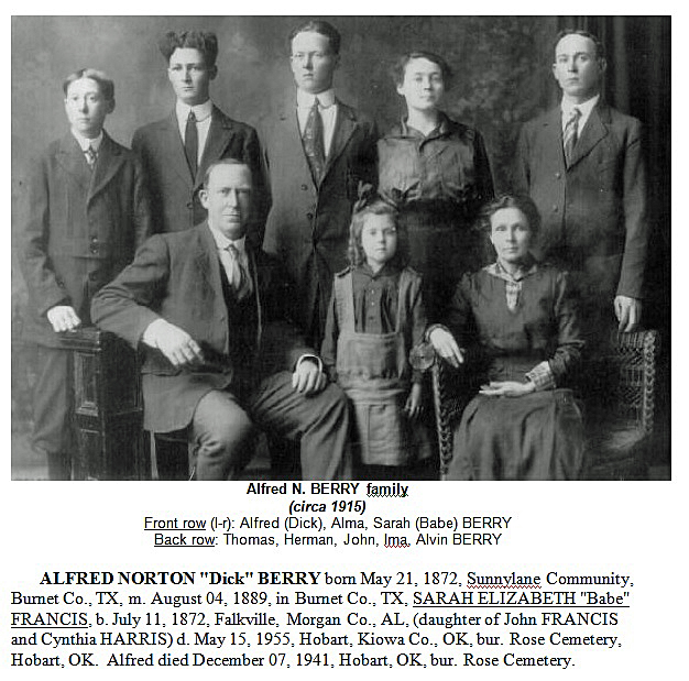 JOHN H. BERRY born September 29, 1827, Fayette Co., AL, m. July 1848 in Fayette Co., AL, ELIZA CATHERINE DENNIS, b. January 21, 1828, AL (daughter of Benjamin DENNIS and Elizabeth BERRY), d. July 21, 1913, bur. Cauble Cemetery, Burnet Co., TX. John died October 07, 1904, Burnet Co., TX, bur. Cauble Cemetery