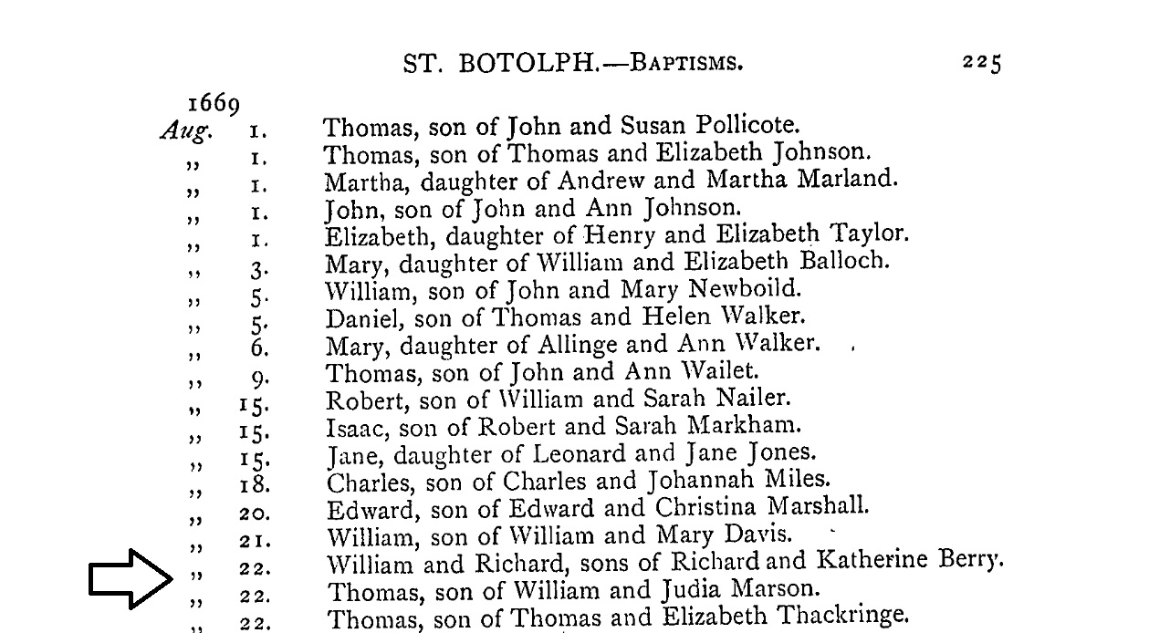 Mary Williamson’s Grandfather, Roger Williamson, and Ann Foster, were in America by 1840 so the Richard Williamson father and son listed in the 1663 ST BOTOLPH Baptisms above could be Rodger Williamson’s ggg grand father. Roger Williamson was likely born around 1700 which would be 4 generations later. Roger and Ann Foster Williamson did name their first son Richard Williamson. Robert and Mary Williamson Berry also named their first son Richard Berry. Mary Williamson’s father was Richard Williamson, son of Roger and Ann Foster Williamson.