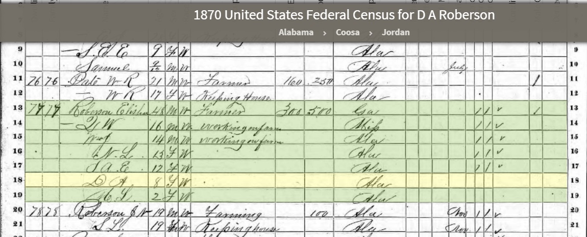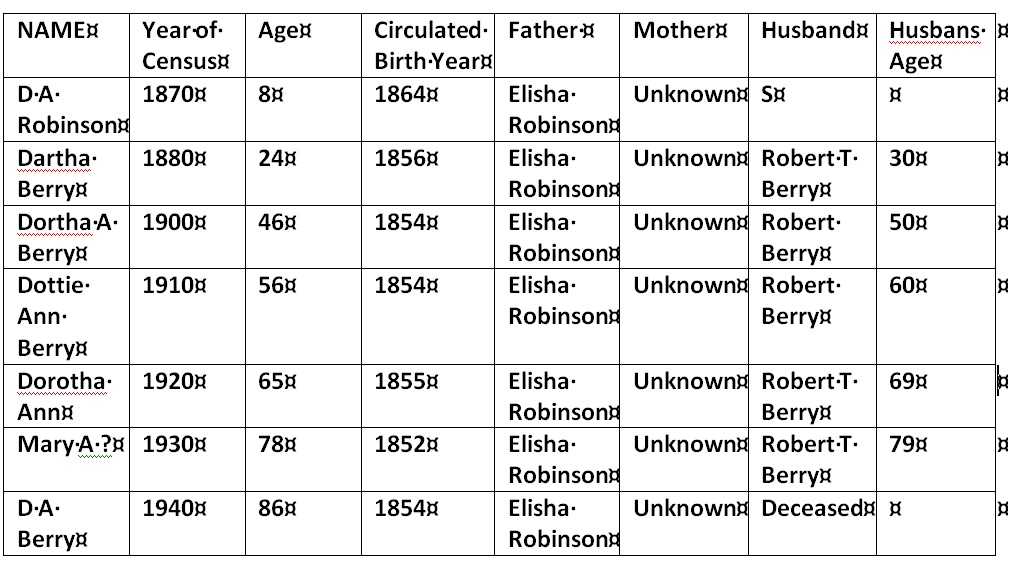 D A Roberson was Dorothy Ann Roberson Age 8 and the daughter of Elishia Roberson Age 48 as seen in the above 1870 Census. This means she was born in 1862.