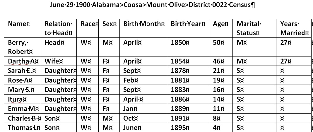 Something happened to Thomas Roberson between 1830 and 1850 because Eda Roberson was still listing her married name in the 1850 Census above. Robert Roberson age 3/12 is really Robert T Berry who was born in 1849.
