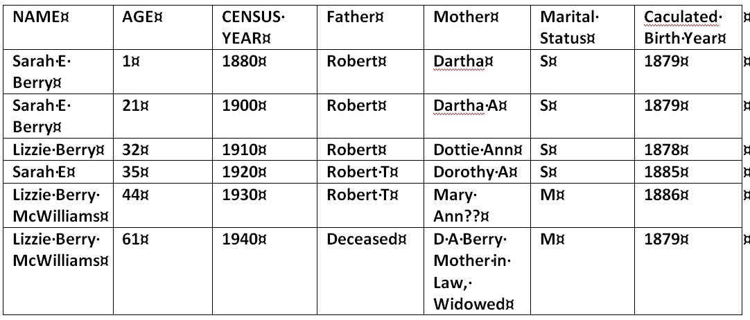 Sarah E Berry was likely named Sarah Elizabeth Berry and nicknamed Lizzie by her family. She was not with the family in every census but was listed as Sarah E Berry in most of them She was the daughter of Robert T and Dorothy Ann Berry. The chart below should explain that Lizzie Berry and Sarah E. Berry is really the same person