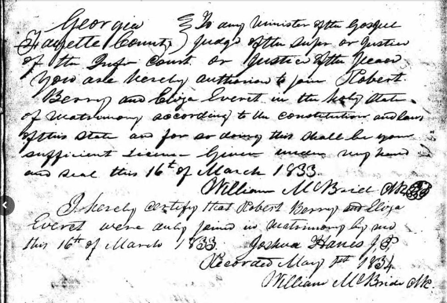Robert and Eliza Everett Berry were in Fayette County Georgia in 1840. The 1840 census for that county shows that they had three boys and 2 girls. This information checks out to what is known about their family.
