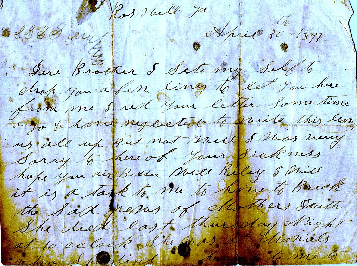 Below is a letter that was sent on April 30, 1897 to Robert Riley Berry by one of his brothers, telling him of their mother's death (Eliza Everette Berry).
