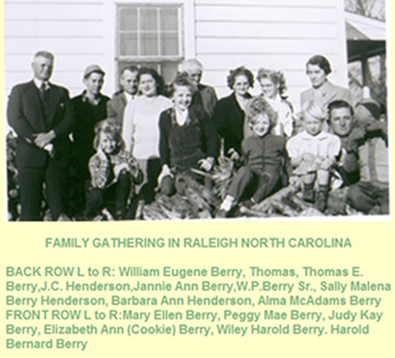 Left to Right back row: Jesse Clyde Henderson holding William Aaron Henderson, Thelma Guest (Bill) Henderson Uncle Bryant’s wife, Dorothy Laryce ( Pete) Henderson McDonald, Eugene James (Jimmy) McDonald Sr. Virginia Lee Henderson Carroll, Joe Watson Carroll, Enos Brown Henderson, Dorothy Alice Padgett Henderson, Patricia Sue Arnette Henderson, William Jennings Bryan Henderson, Benjamin Berry Henderson Sr. Pattie Alma McAdams Berry, William Eugene Berry.
