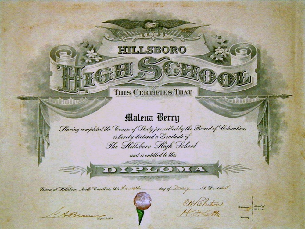 Mother graduated from Hillsborough High School on May 4th 1928. Thirteen years after Sally Malena Berry graduated from High School, on (May 4th 1941), Grandma Ida Ann Wilson Berry attended the Barocaloric Service of her oldest granddaughter which also was held at Hillsborough High School. My grandparents returned to Mebane to spend the night with her son, Woodrow Berry. While crossing the road in front of Woodrow's home she was hit and accidently killed by an automobile.