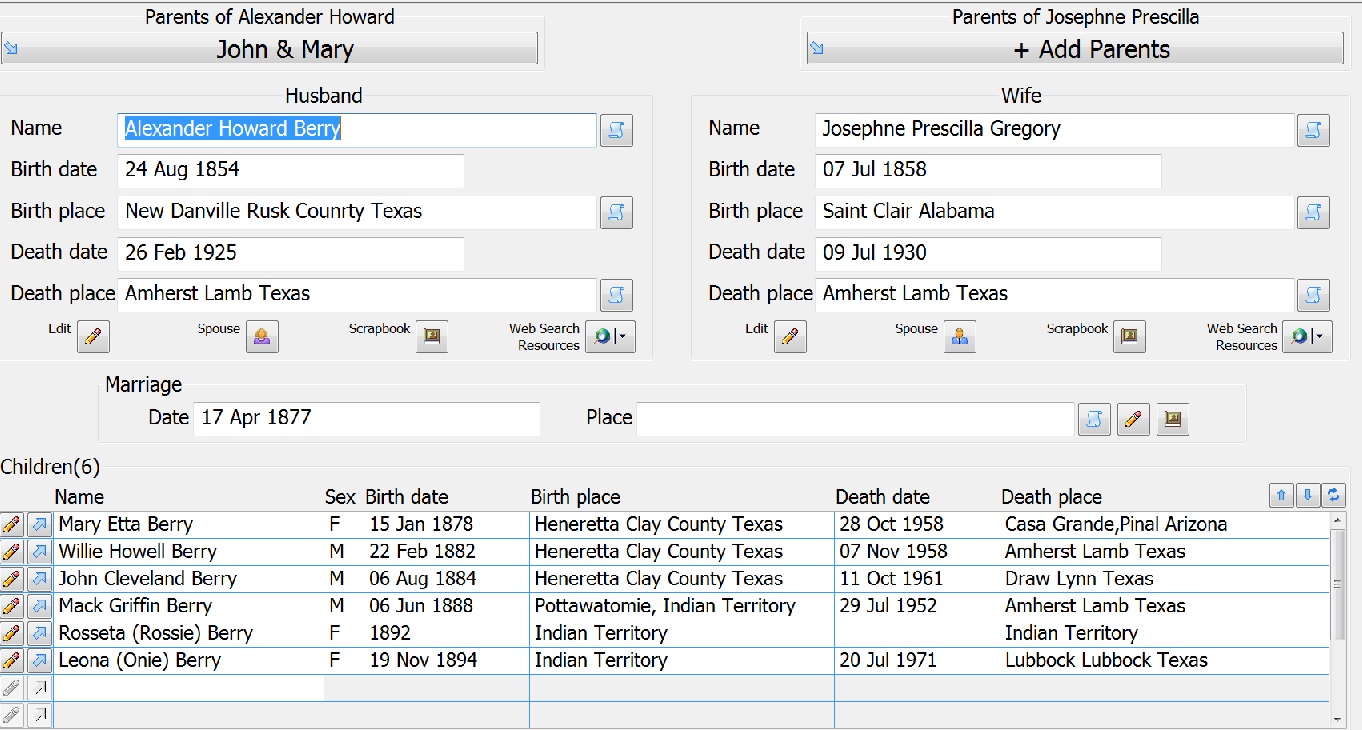 - 6 Generation Alexander Howell and Josephine Prescilla Berry,Texas
