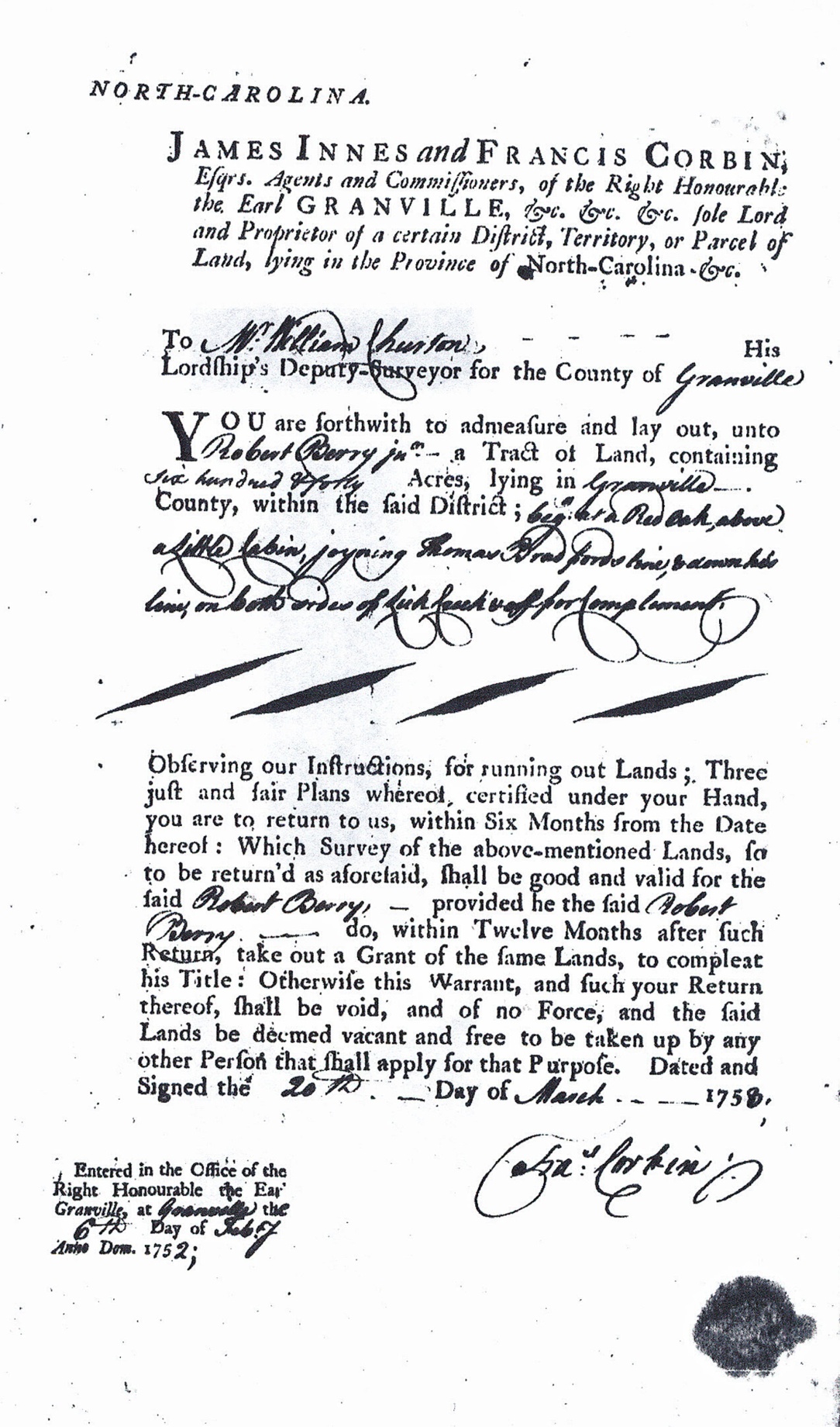 On February 6th, 1752, Robert Berry OC made entry in Granville County, North Carolina, for the land he had homesteaded. (Fig. 17, Pg. 69)