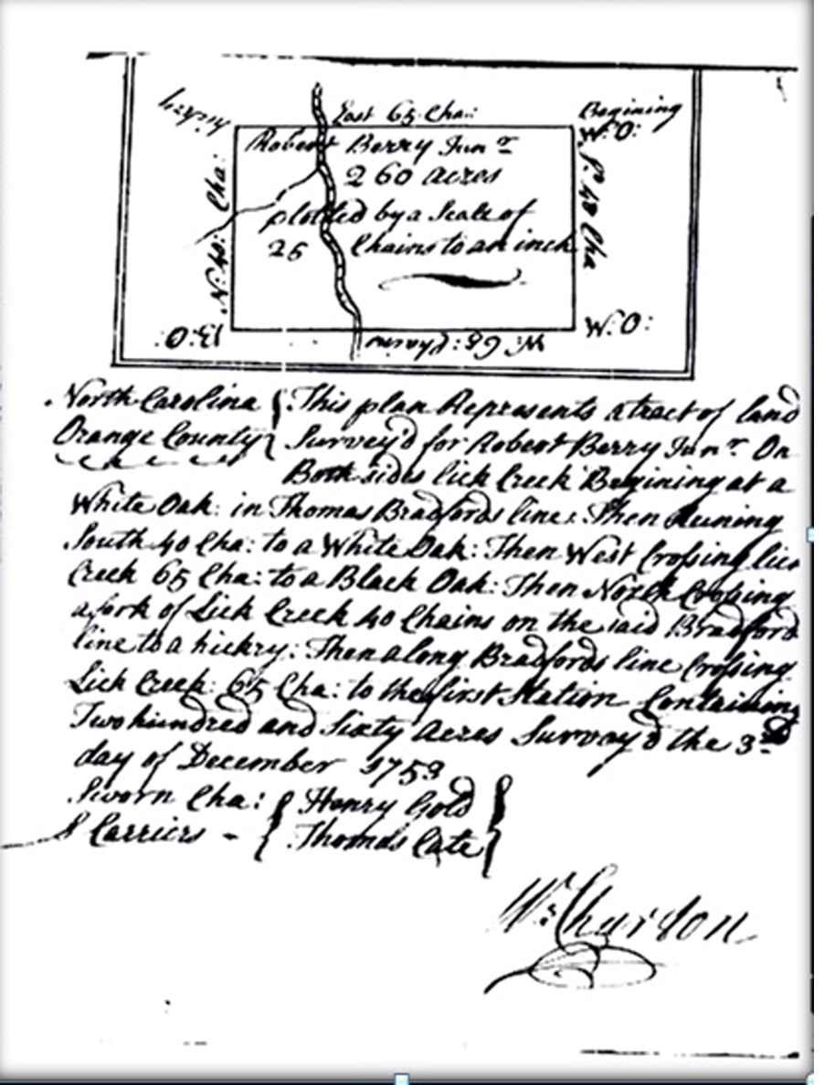 The instructions given to William Churton in the Warrant read: You are forthwith and layout to Robert Berry Jnr. a track of land containing 640 acres lying in Granville County in the said district “beginning at a red oak above a little cabin, joining Thomas Bradford’s line. Assemble lines on both sides of Lick Creek (unintelligible word) for complement”. There is a lot of information connected to this document. In order to acquire a Granville Grant several steps had to be followed. The first requirement was that an improvement had to be made on the property in question. Second there was the Entry and then the Warrant. The next step was the survey and the final step was issuing the grant. Robert Berry’s OC survey and the grant records were recorded in Orange County, North Carolina.