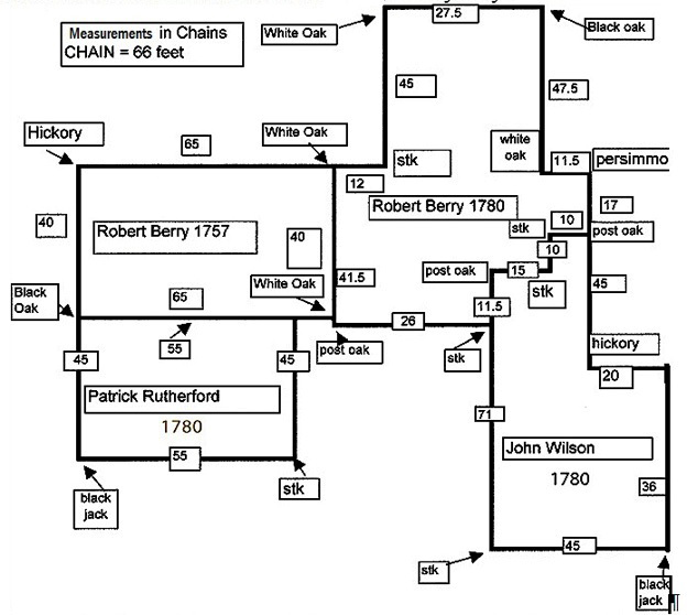Robert Berry’s property was described as being on both sides of Lick Creek adjacent to Thomas Bradford’s property line. The survey started at a White Oak tree in Thomas Bradford’s line on the east side and ran south, west across Lick Creek, then north and back east along Bradford’s line.