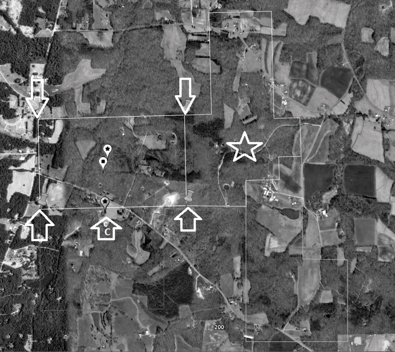 On the map in Fig 20, the corners of the original Granville Land Grant are marked with white arrows. The arrow with the C in it marks the chimney. This landmark is all that remains of the Fiddleton Plantation Home which was built in 1766. The white balloon with the square is the location of the original family cabin. The balloon with star marks the site of the Robert Berry Fiddleton family cemetery where 23 of our ancestors are buried. The tract of land with the white star was granted to Robert Berry OC in 1780. Robert sold most of this tract to William Armstrong on October 14th, 1800. (Deed bk13 Pg.330) The crossed Arrows on this map joining Robert Berry’s OC newly acquired property was granted by North Carolina to the Wilson Brothers in 1780.