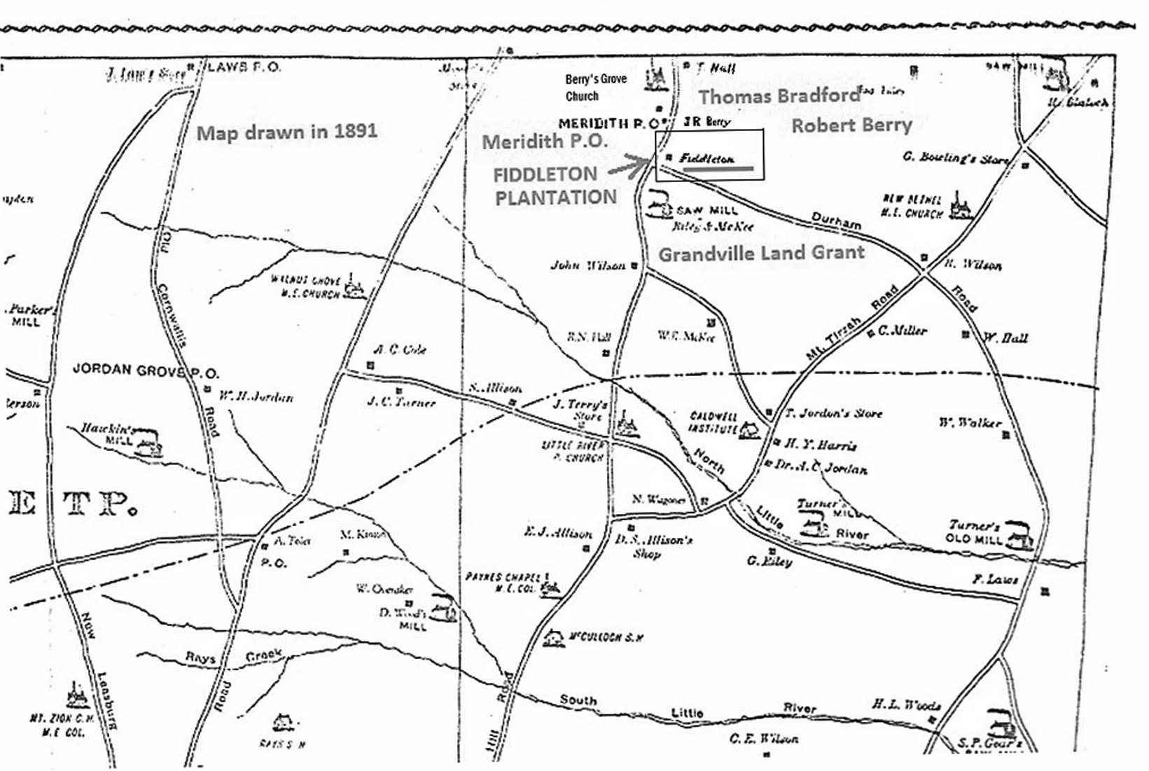 Robert Berry OC apparently named his plantation Fiddleton. The name of the plantation is noted on a map drawn by George W Tate at the Bingham School in 1891. The location of this note on the map corresponds to the actual location of Robert Berry’s Granville land Grant. The name Fiddleton is another clue that Robert Berry’s OC family came from England. There is a town named Fittleton located in Wilshire County, England. (See Fig.9 Page 40)