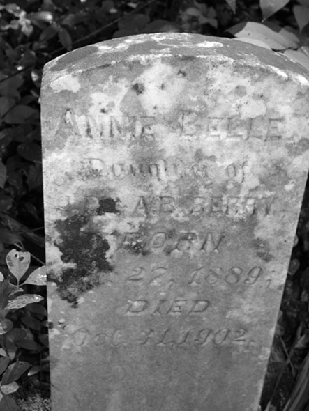 Anne Belle Berry was buried in 1912 and her brother, James Berry, was buried in 1896 in the Fiddleton Cemetery. They are the grandchildren of Thomas Person and Sarah Lunsford Berry. Their Parents were James P. and Artelia Wedding Berry.