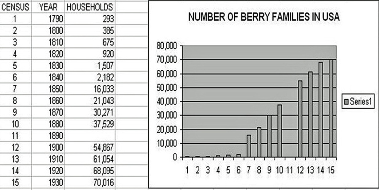 From the table below, you can see there were 2182 Berry households in America in 1840. Ten years later in 1850, there are 16,033 Berry households in America. That is an 800% increase in ten years, amounting to about 1400 new Berry households each year.