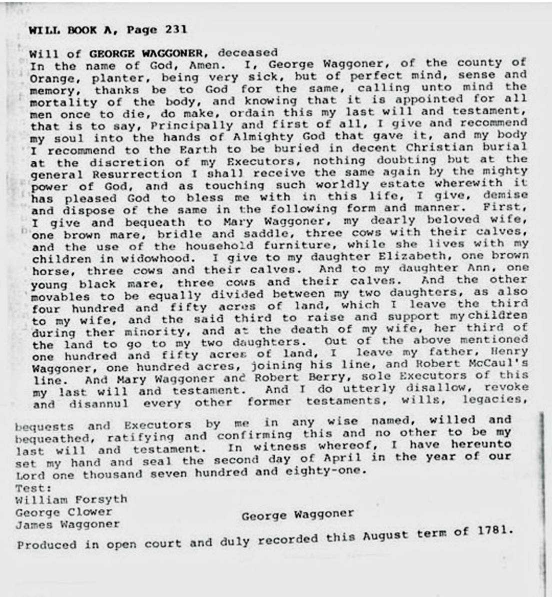 - George Waggoner’s Transcribed Will dated April 2nd, 1781