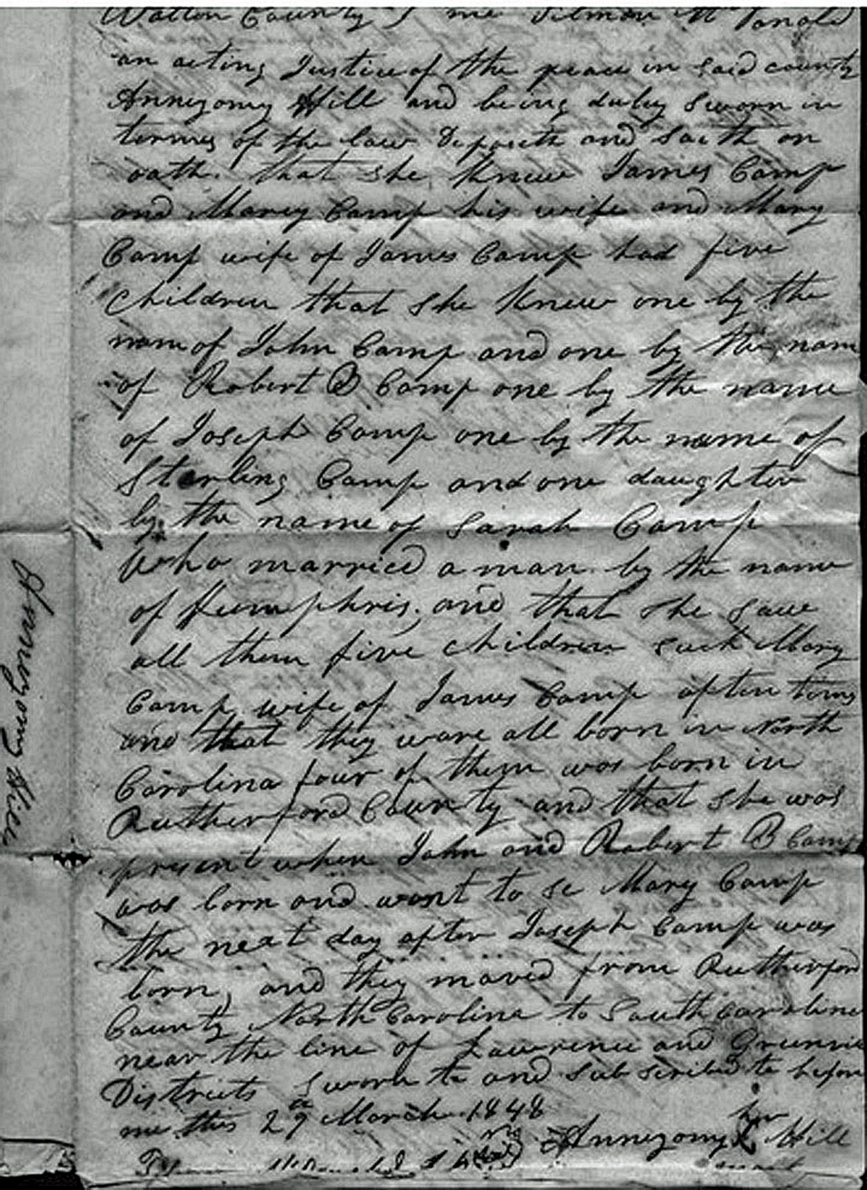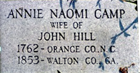 - Annie Naomi Camp b. 1769, Orange Co., NC — d. after 1850 Walton Co., GA — m. John Hill (She gave the Affidavit)