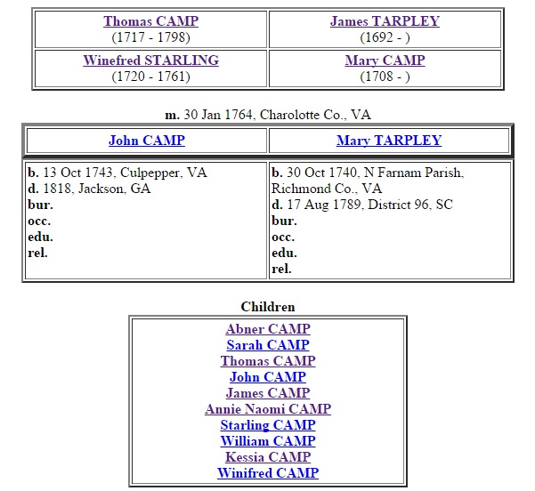 John Camp b. October 13, 1743, Orange Co. VA d. 1813 Jackson Co., GA. Buried Lebanon Church, Greenville, SC; m. Mary Tarpley January 30, 1764. John Camp was the third born to Thomas Camp and Winifred Starling in Orange Co., VA.
