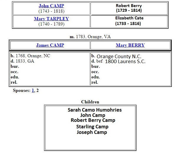 - James Camp b. 1768, NC — d. married Mary Berry Waggoner between November 1781 and February 1782 in Orange County, North Carolina. (Mary Berry was the widow of George Waggoner.)