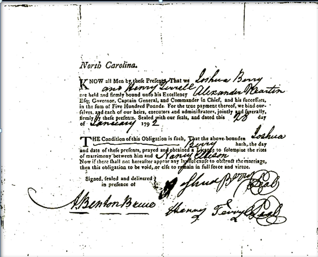 The second record found about Joshua Berry was his marriage bond to Nancy Ellison dated January 28th, 1792. Henry Terrell was his bondsman.
