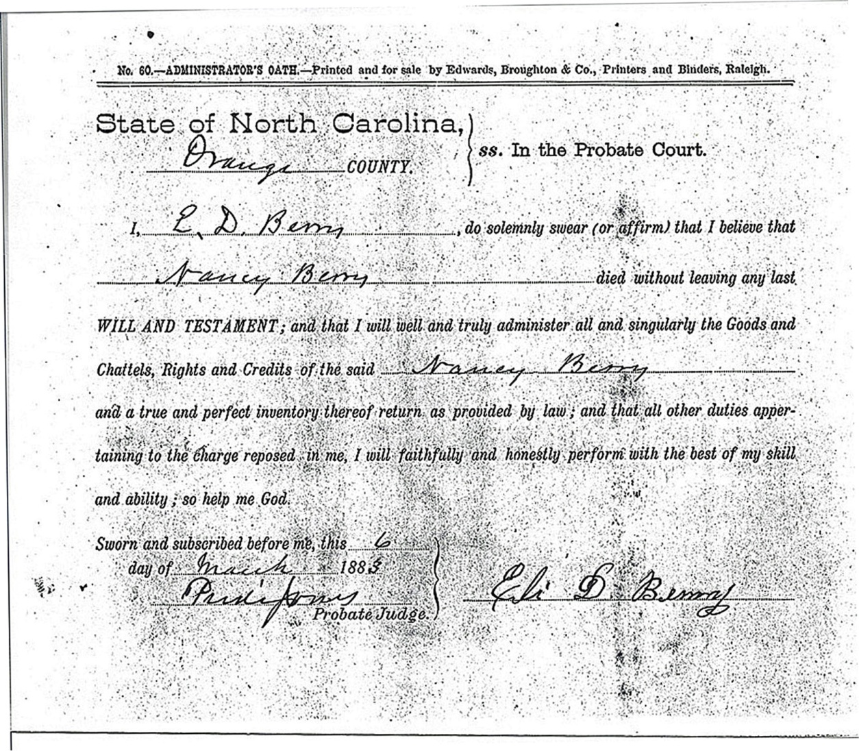 Below is an application that Eli D. Berry submitted to the county in order to serve as administrator of his Cousin Nancy Berry’s estate. Nancy had inherited her estate when her mother, Nancy Ellison Berry, died sometime before 1860. Nancy Ellison Berry may also have died from the worldwide flu epidemic that took the lives of four other members of our Berry family in 1858. Joshua and Nancy Ellison Berry’s spinster daughter, Nancy Berry, died intestate in March, 1883. Nancy’s brother, Eli Berry, was still alive but Eli may have known that his son, Eli D. Berry, was better qualified to manage the duties of an administrator. Eli D. Berry was only 21 years old at the time and likely better educated than his father.