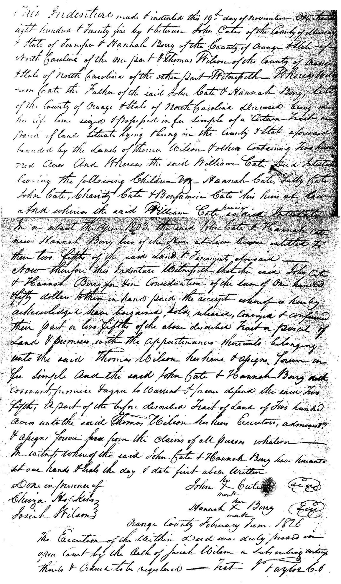 After Elizabeth Smith Cate died in Orange County, North Carolina, in 1825, Hannah Cate Berry and her brother John Cate negotiated a sale of the William Cate homestead to Thomas Wilson. The document needed the signatures of William and Elizabeth Smith Cate’s five children. After Hannah Cate Berry and John Cate signed the document in North Carolina, John Cate and Stephen Smith went to Tennessee to get John’s sister, Sarah Cate Berry Pigg’s, signature. I have no idea where Benjamin Cate or his sister, Charity Cate, were living at the time. William Cate left the property for his wife to use until her death and then it would go to the five children.