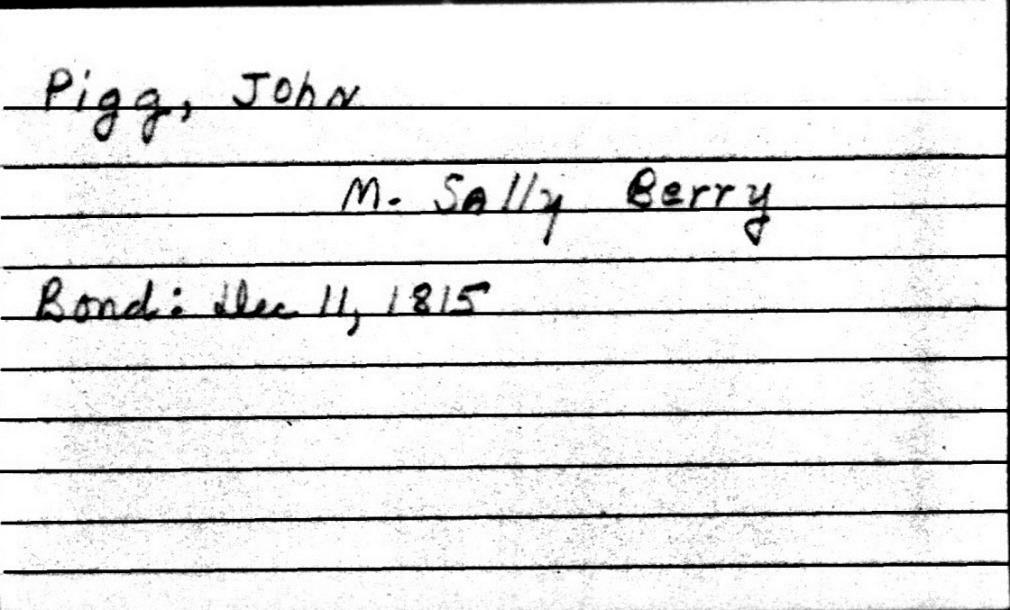 According to folklore believed by descendants of Thomas and his wife, Sarah Cate Berry Pigg, Thomas Berry was killed by Indians in Tennessee while seeking land. This seems to be verified in Robert Berry’s 1812 will. Thomas Berry was listed as deceased in that document. William was to receive an inheritance of one Pound, which means he was still alive in 1812.