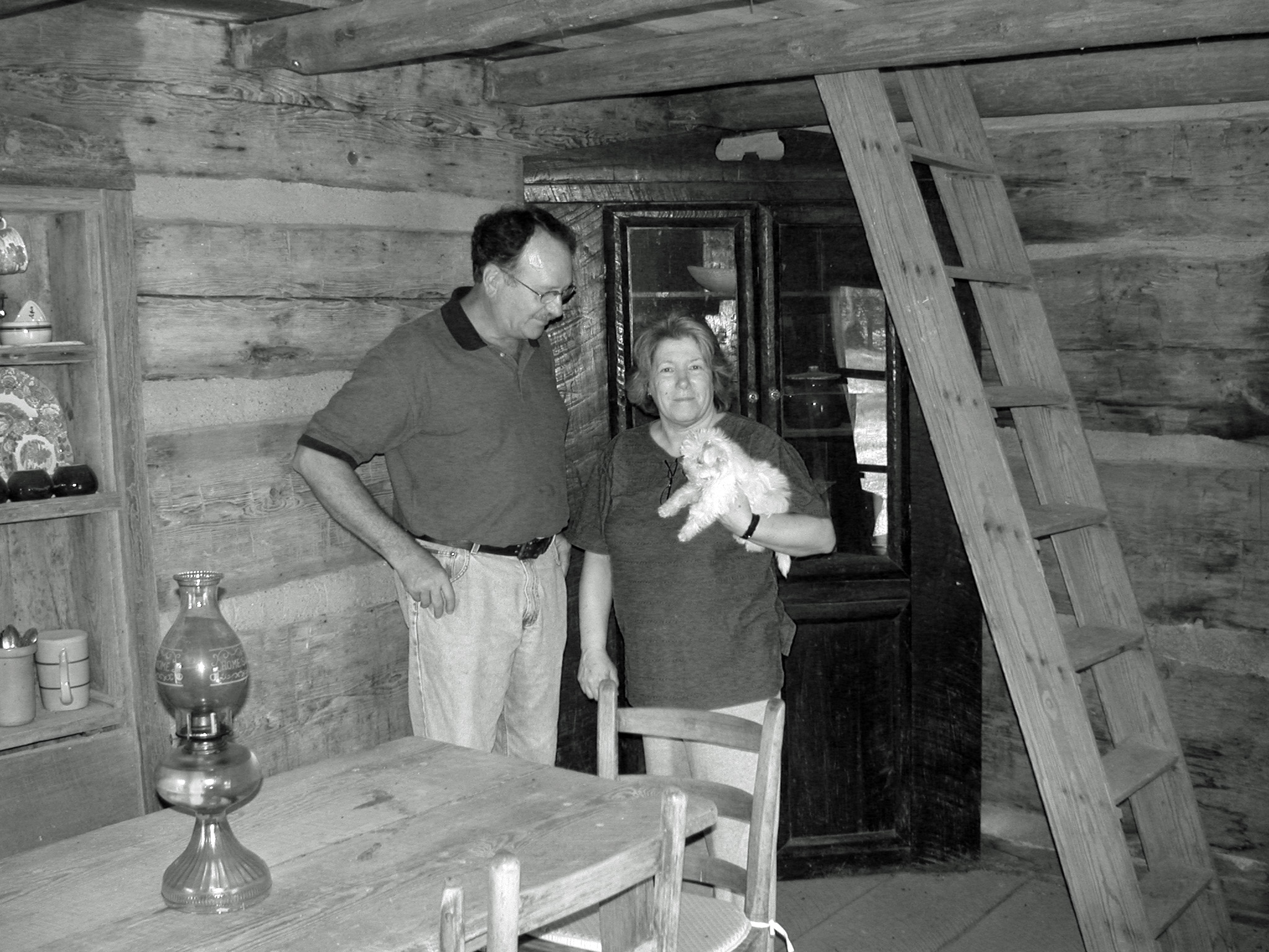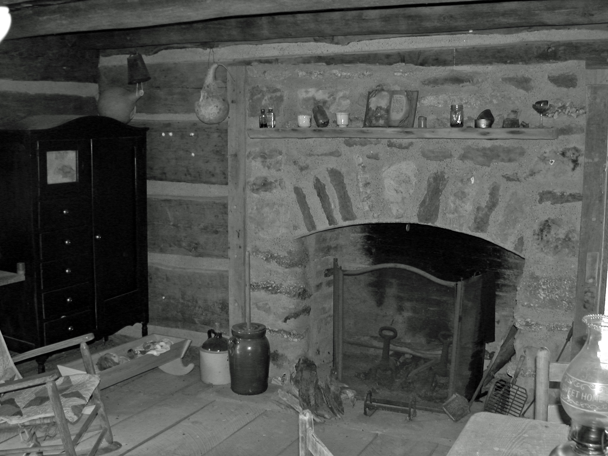 This cabin was secured from the inside and outside by a string latch. The door is hinged to open to the outside of the cabin. This is how a latch of this type works. There is a wooden bar about 2.5 feet long and about the size of a 2 by 4 mounted on a pivot in the center of the inside of the door. There is a bracket made of wood on the opposite side of the door frame from where the hinges are mounted. When the bar drops into the bracket the door cannot be opened. There is a string attached to the middle of the bar that is long enough to pass through a hole in the door which is about a foot above the bar and then hangs down on the inside or the outside of the door. The bar can be raised out of the bracket on the inside of the door by pulling the string that is hanging outside the door. The door can then be opened and closed at will. If you are threatened by intruders or at night while you’re sleeping, you simply pull the string inside and lower the bar into the bracket and there is no way to open the door from the outside. When you leave the house, you place the string through the hole in the door and let the bar fall down into the bracket. This would keep animals out of the house and prevent wind from blowing the door open but provided no protection from any intruders while you are away from home, however. This is a very simple and clever mechanism. When I visited the cabin for the first time, I had never seen this method of locking a door before.