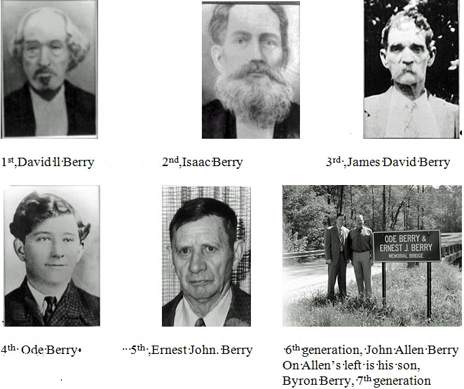 Robert and Mary Williamson Berry, Princess Anne County, Virginia → Robert and Elizabeth Cate Berry, Orange County, North Carolina → Thomas and Sarah Cate Berry, Orange County, North Carolina → David II and Elizabeth Shipman Berry, Wayne County, Tennessee → Isaac and Amanda Josephine Blackwood Berry, Wayne County, Tennessee → James David and Melissa Harlow Berry, Wayne County, Tennessee → Ode and Emma Lee Stutts Berry, Wayne County, Tennessee → Ernest John Berry and Roxie Berry, Wayne County, Tennessee → John Allen Berry