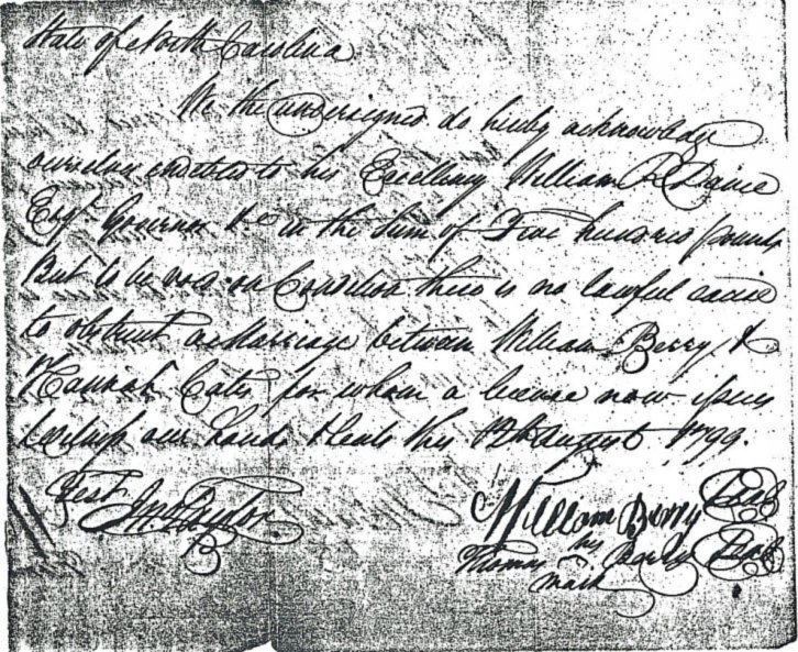 This indenture made and indentured this the 23rd day of November A.D. 1830. Between Henry Berry of the County of Orange and state of North Carolina of the one part and William Berry and Person Berry both of the County of Orange and state aforesaid of the other part witnessed the said William Berry and Person Berry for and in consideration of the sum of $500 to him in hand paid by the said William Berry and Person Berry before the sealing and delivery of their presence the receipt whereof is hereby knowledge, have this day bargained and sold unto the said William Berry and Person Berry there is assignees forever one track or parcel of land situated lying and being in the County of Orange aforesaid on Lick Creek for the Milton Road crosses said Creek William Lipscomb’s corner running fence and easterly course the son of said road as it meanders 35 chains and 33 links to the stake in the said road and two red oak pointers, thence South 26 chains to a black Jack, Rankin McKeey corner and Richard Holeman’s line, thence North 66°, West six chains to the four turkey lick Ranch, thence down the said branch as it meanders to Lick Creek thence down the creek as it meanders to the first station containing by estimation 100 acres and 3/10 of an acre be the same more or less: and the said Henry Berry for himself and his heirs the warrant and defend the right and title of the foregoing describe land and premises for the said William Berry and Person Berry and their heirs and assignees forever the said Henry Berry and his heirs and against the lawful claims of all other persons whatsoever. In testimony whatsoever. In testimony whereof the said Henry Berry hath hereunto set his hand and seal the day and date first year as written.