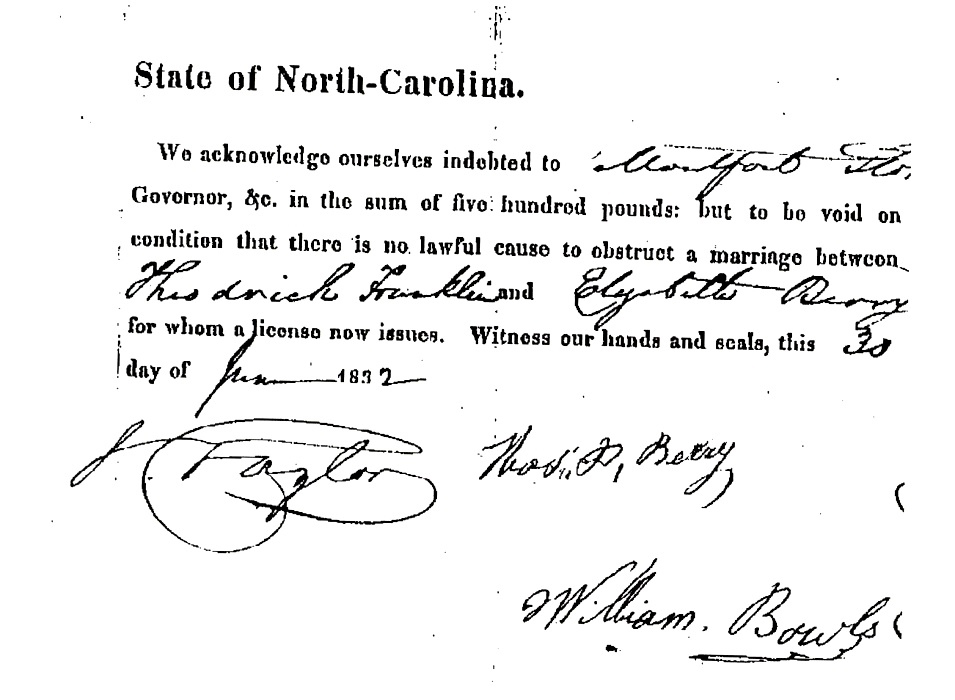 When Elizabeth Berry got married her half-brother, Thomas Person Berry, signed her wedding bond. The other signature on the bond was William Bowles, who was William Clarence Berry’s father-in-law. This was a clue that was overlooked for many years. Theodrick and Elizabeth Berry Franklin were married on June 30, 1832, and their daughter, Temperance Jane Franklin, was born on October 17, 1832. Many years later, Temperance Jane Franklin wrote in her Bible that her grandfather’s name was John Berry.