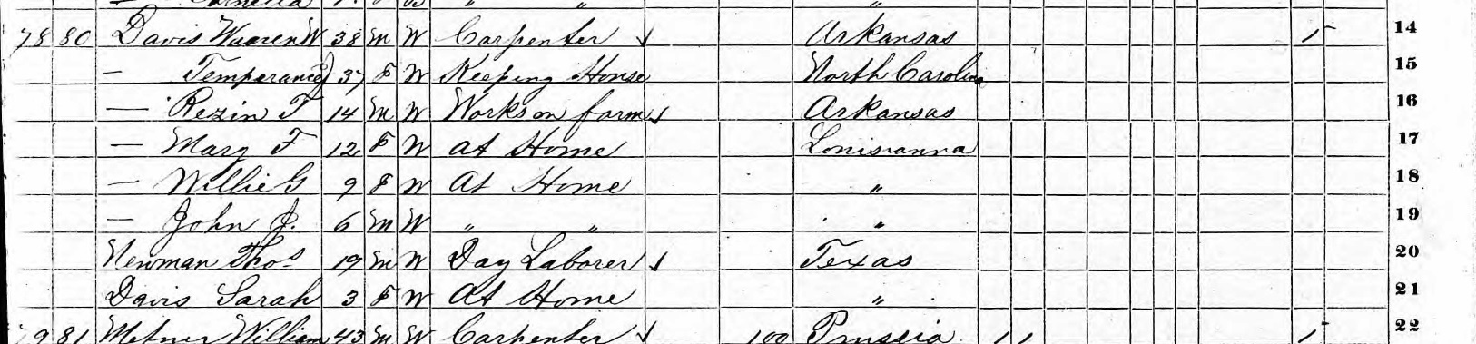 Temperance Jane Franklin and her husband, Warren Davis, were married November 9, 1854, in Bienville Parish, Louisiana. Their first son was born in Arkansas and the other three children were born in Louisiana. The couple had only been living in Texas less than 3 years when this census was taken.