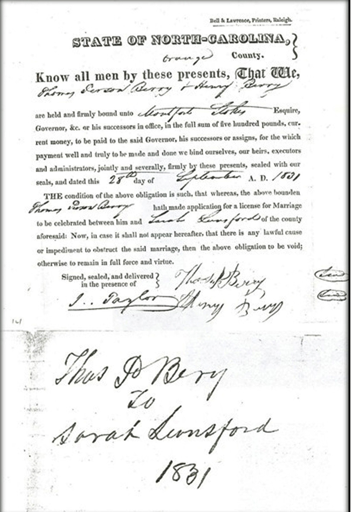 Thomas Person Berry and Sally Lunsford were married on September 30th, 1831, and had only been married a year when Thomas P. Berry signed his half-sister’s wedding bond. Thomas Person and Sarah Lunsford Berry are my 2nd great-grandparents. Thomas Person Berry’s marriage bond to Sarah Lunsford was signed by his uncle, Henry Berry, and Thomas Person Berry himself.