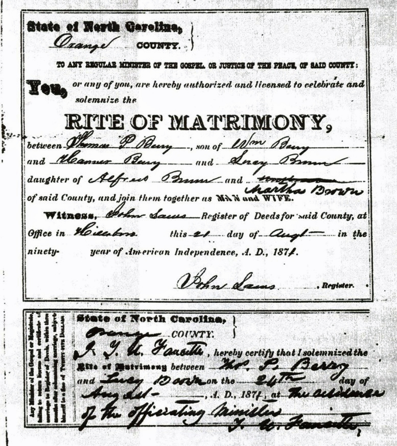 Thomas Person Berry’s second wife was Lucy Brown (Lucy Brown was the daughter of Alfred and Martha Brown). Thomas and Lucy had five children who were very young when their mother, Lucy Brown Berry, died.