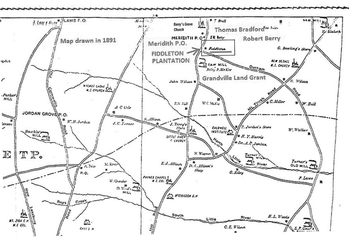 The spot to the left of the name Fiddleton is where Thomas Person Berry’s home was located. He built this home in 1852. Thomas Person Berry died 7 years before this map was drawn. This house may have been vacant in 1891, and that may be the reason it was not identified as his home.