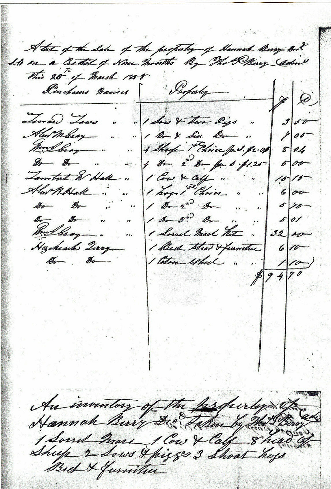 Thomas Person Berry, William J. Gray, and Doctor C. Parrish posted bond to the state of North Carolina on the 25th day of February, 1858. The 3 men agreed to pay the state $750 if the inventory of Hannah Berry’s estate was not delivered to the court. Thomas Person Berry was appointed administrator of his mother’s estate. He was charged with the responsibility to return a true and just inventory of her estate. Doctor C. Parish was Sarah Lunsford Berry’s nephew. He was the son of David and Mary (Polly) Lunsford Parish. William J Gray was a neighbor of Thomas Person Berry.
