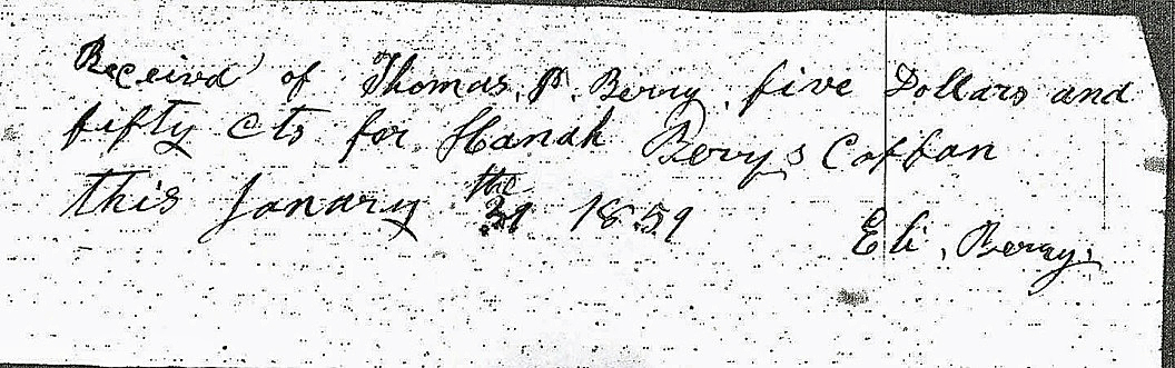 Eli Berry, who was Thomas Person Berry’s first cousin, was engaged to construct Hannah Cate Berry’s coffin. As you can see from the receipt listed below, Eli Berry received payment of $5 on January 31, 1859.