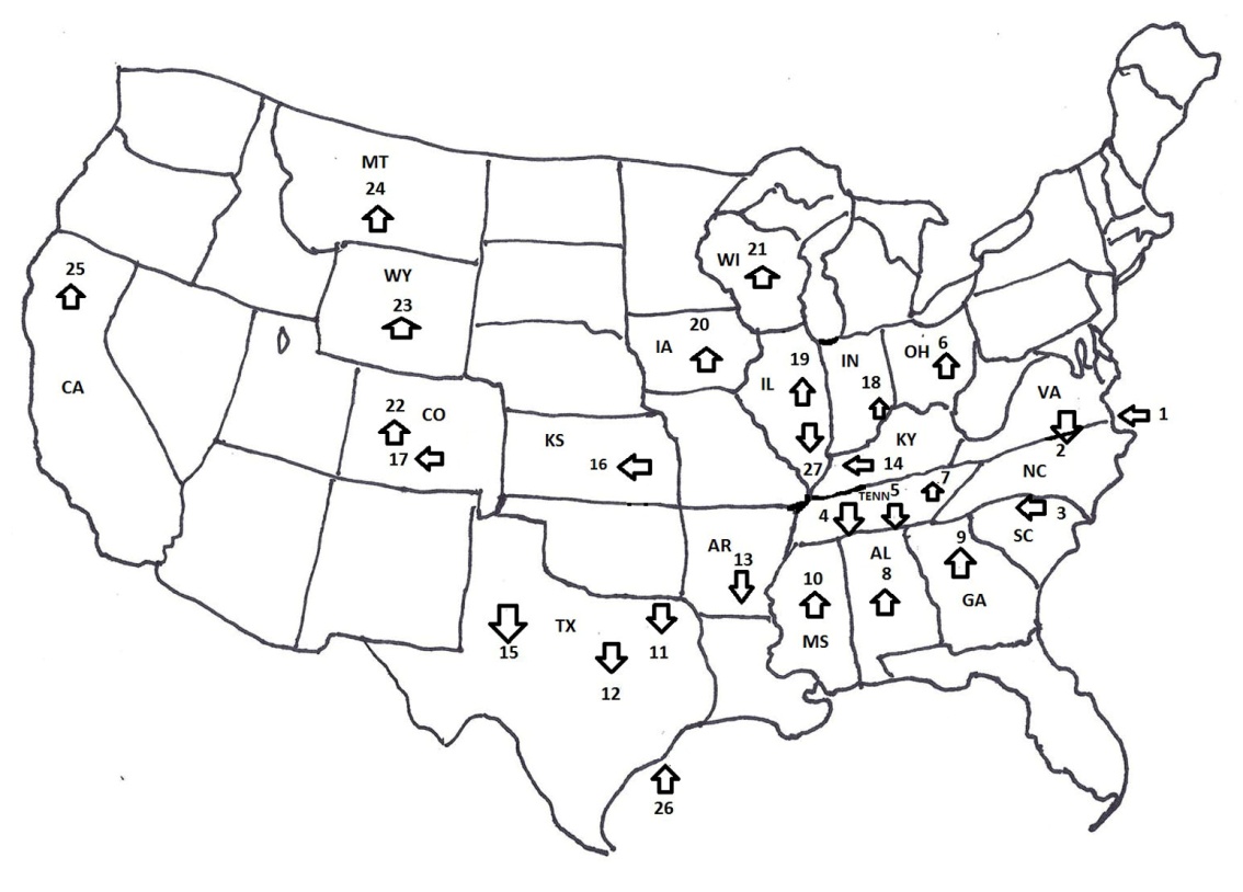 Alabama, Arizona, Arkansas, California, Colorado, Florida, Georgia, Idaho, Illinois, Indiana, Kansas, Kentucky, Minnesota, Mississippi, North Carolina, New Jersey, Oklahoma, Ohio, South Carolina, Tennessee, Texas, Virginia, Wisconsin, Wyoming.