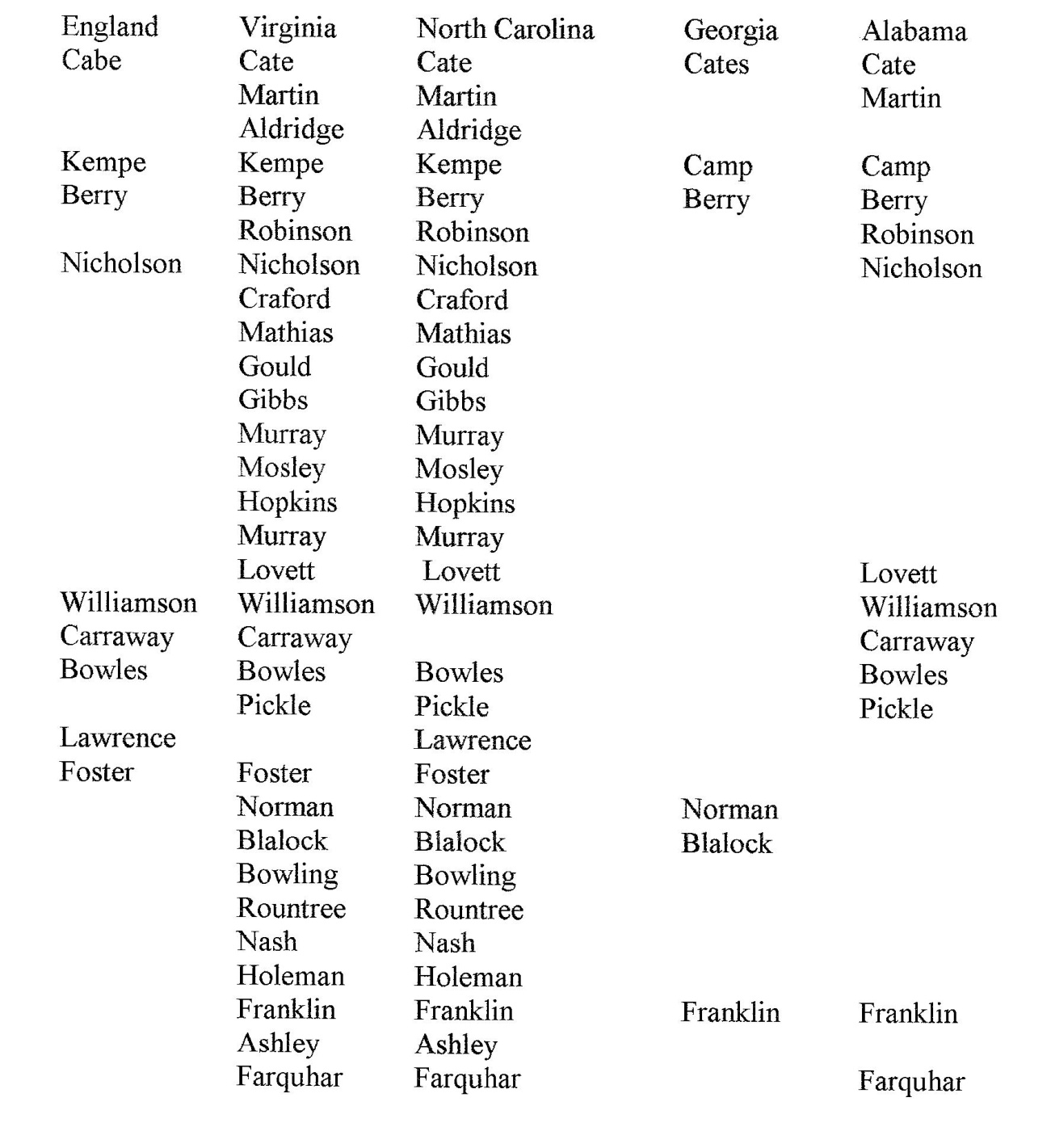 Their surnames were: Aldridge, Anderson, Ashley, Berry, Blackwood, Blalock, Bowling, Bowles, Breeze, Brewer, Brinkley, Brown, Camp, Carr, Carraway, Cate, Cates, Clayton, Cody, Coleman, Cooper, Cozart, Crow, Crowley Davis, Dickey, Dixon, Dobbins, Dunnagan, Dunning, Ellison, Everett, Farley, Farquhar, Foster, Fowler, Franklin, Garrett, Giles, Gray, Hall, Harlow, Harper, Harris, Henderson, Hanson, Hightower, Holeman, Hollowell, Holt, Horner, Horton, Howard, Hunley, Hutchins, Hutchinson, Hutto, Jeffreys, Johnson, Kemp, King, Kizzah, Lawrence, Lindsey, Long, Lovett, Lunsford, Maddry, Malone, Mangum, Martin, Mathias, McKee, McClure, Meadows, Miller, Mincey, Mitchell, Moake, Moore, Murdock, Nichols, Norman, Oakley, Parker, Parrish, Phillips, Pickle, Pigg, Polk, Ray, Reed, Riley, Rimmer, Rodgers, Rountree, Scott, Shepard, Shipman, Simson, Smith, Starke, Stutts, Summers, Tanner, Tapp, Taylor, Thompson, Tilley, Tolar, Tompkins, Turley, Waggoner, Walker, Watson, Webb, White, Whitten, Whitson, Williamson, Wilson, Wishards, Wright and hundreds more.