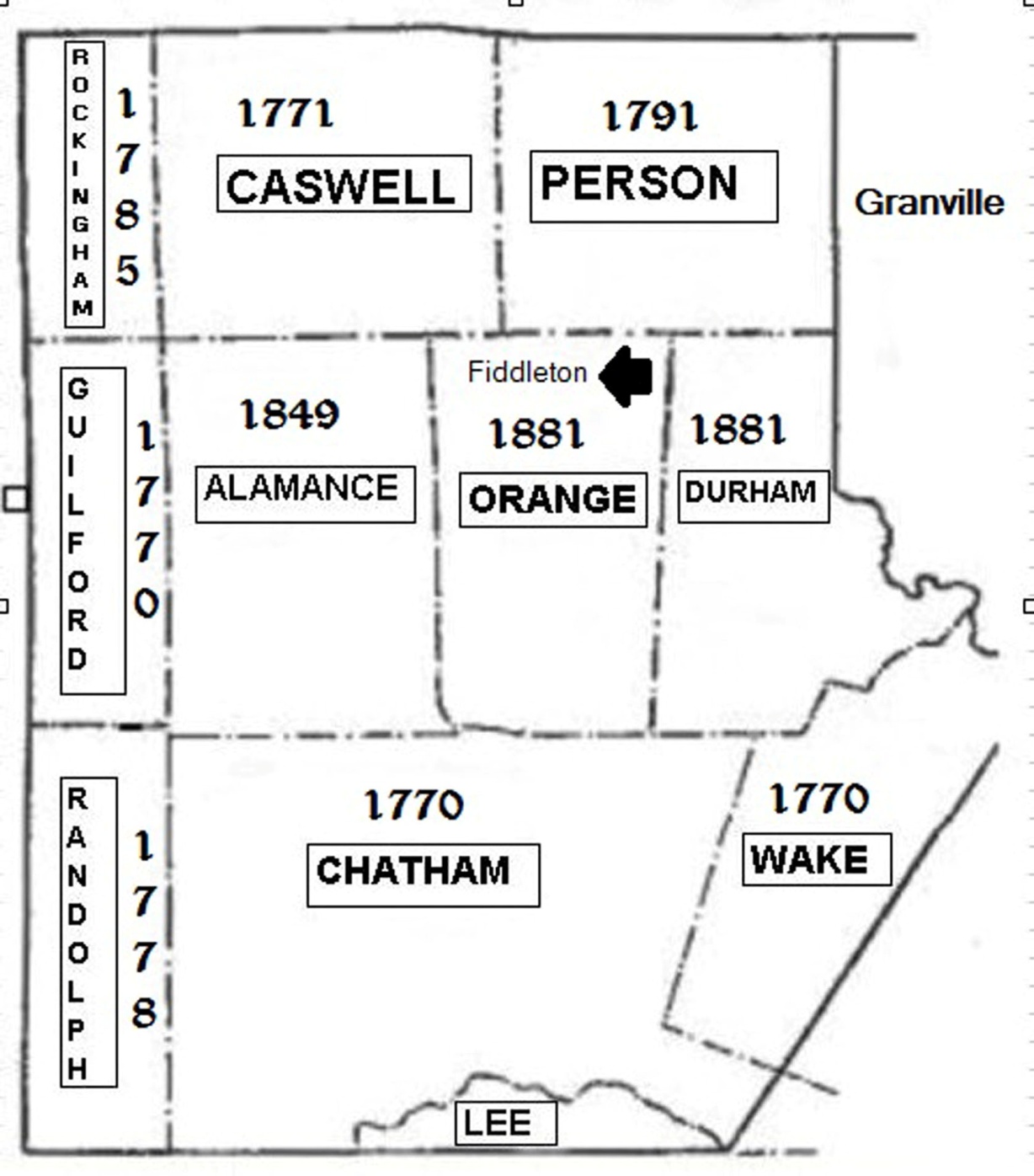 This is a map showing the original size and the breakup of Orange County that ended in 1881 with the creation of Durham County. The Western part of Orange County was used to create parts of Randolph, Guilford, and Rockingham Counties in 1770. Caswell County was formed from Orange in 1771. Also parts of Wake and Lee Counties were split from Orange County in 1770. Alamance County was formed in 1849. Person County was created in 1791 by splitting Caswell County in half.