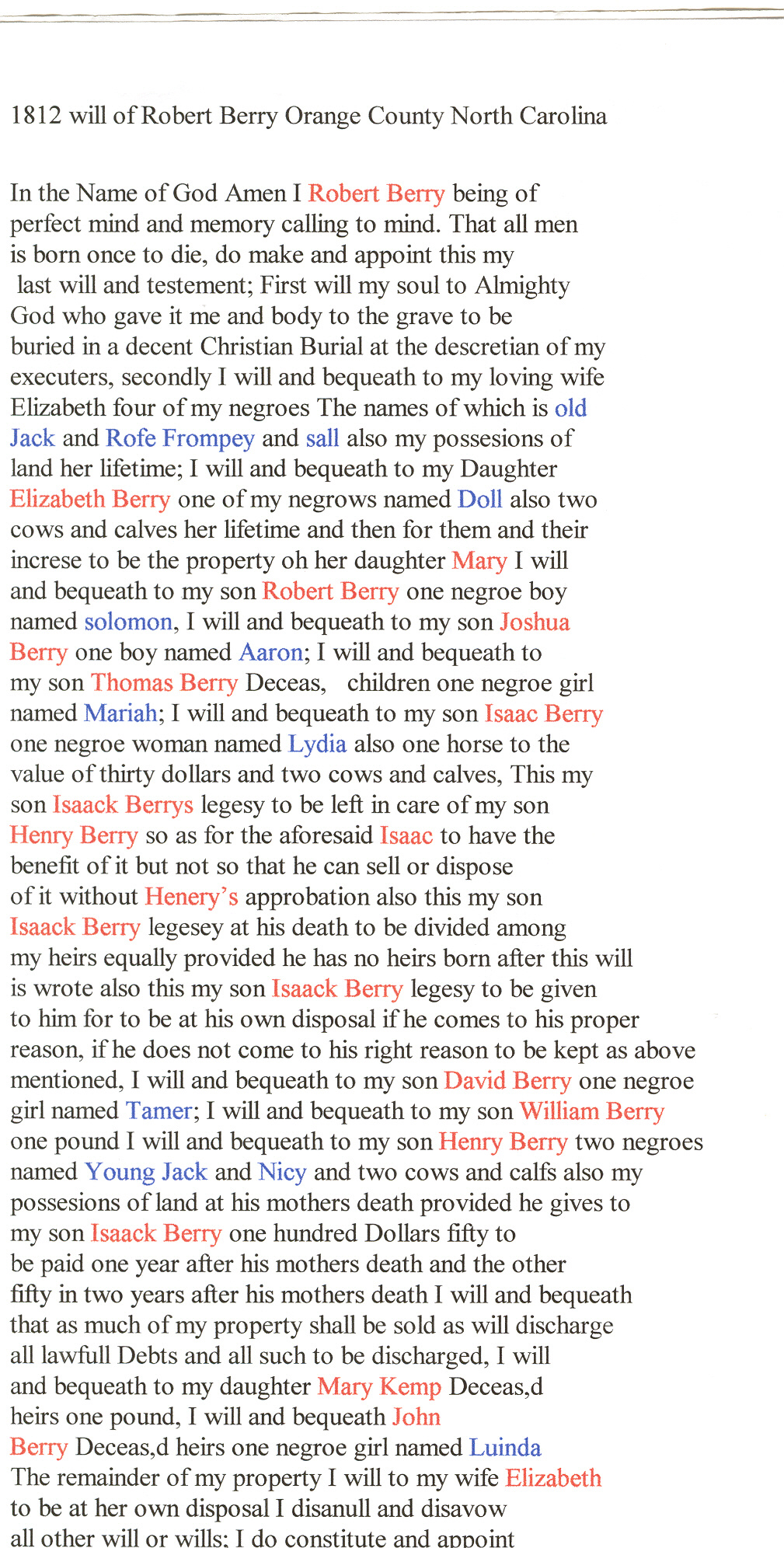 Transcript of Robert Berry's Original Orange County NC 1812 willA Copy of Robert Berry's Original Orange County NC 1812 will