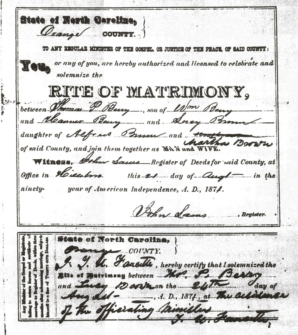 Thomas Berry may have come back to Orange County, NC after staking out land in Tennessee. He and his family likely returned to Wayne County, Tennessee, He may have been killed after returning to Tennessee with his family. We know by the marriage document on the left that Sarah Cate Berry was married in Tennessee in 1815. It is currently unknown if William Berry ever returned to his home in Orange County, North Carolina. The last evidence that places William Berry in Orange County was the birth of his youngest son Thomas Person Berry on June 1st 1808. Thomas Person Berry identified William and Hannah Cate Berry as his parents in his marriage licence to Lucy Brown August 21st 1871. This document was the first proof I found linking Thomas Person Berry to his parents.