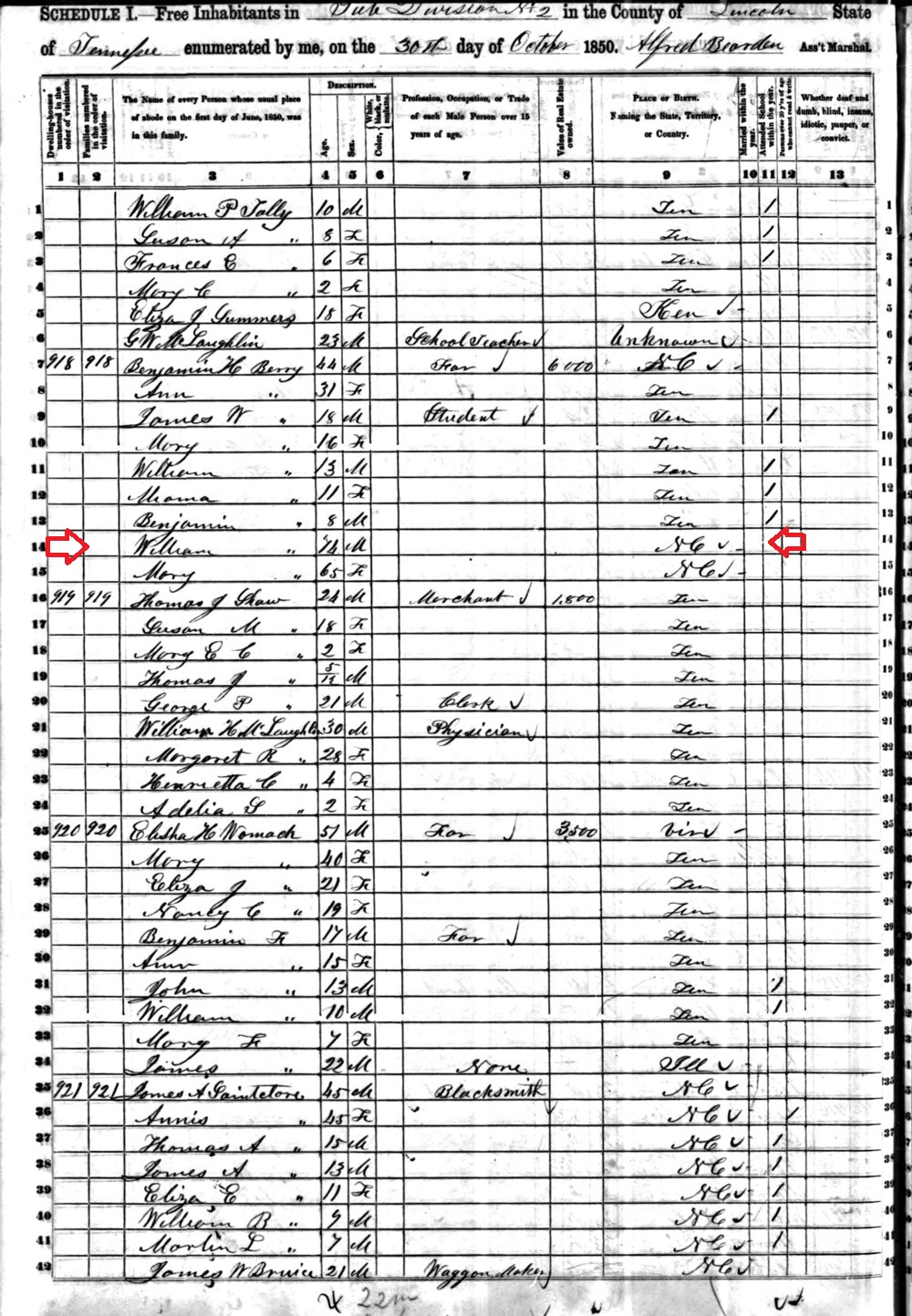 William Berry was the right age and he was born in North Carolina. William Berry was also listed in the 1860 census but he died shortly after the census was taken.There are two counties between Wayne County where Sarah Cate Berry lived and Lincoln County, Tennessee. Lincoln is East of Wayne County and both counties are on the Alabama line. No descendants have been located at this time. William's son, Benjamin H. Berry was also born in North Carolina If you know any of William Berry's descendants Please contact me.