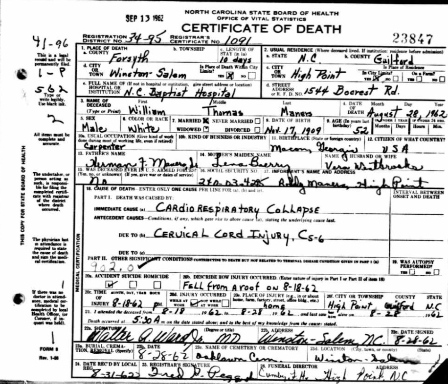 William Thomas Manners married Vera Mae Westbrooks about 1929 and they had no children in the 1930 Griffin, Spalding Georgia Census. The couple listed three sons and a daughter in the 1940 High Point, Guilford, North Carolina Census. He was born in November 17th 1909 and died in August 28th 1962.