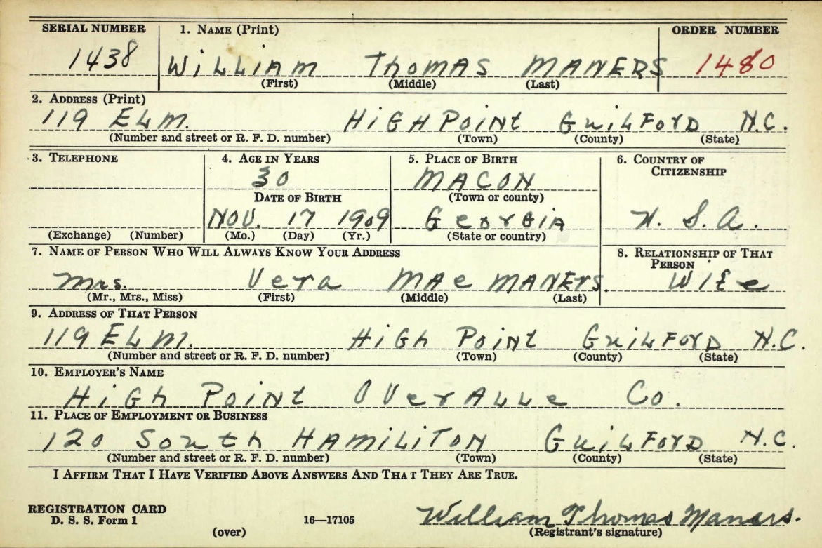 William Thomas Maners World War Two Draft Registration